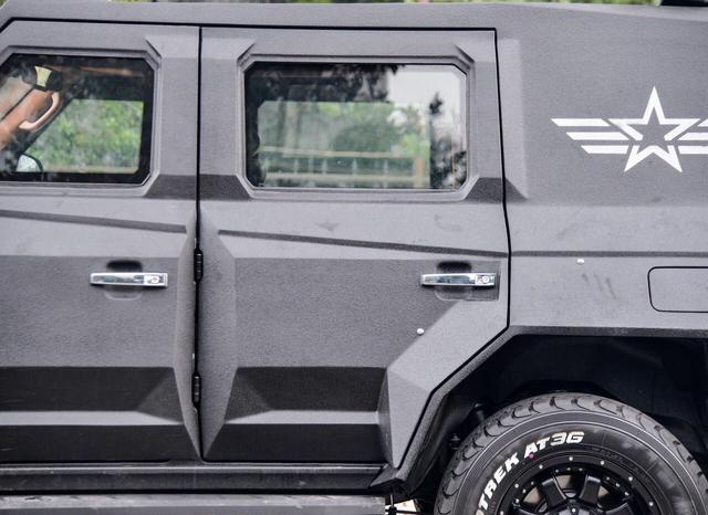 車身表面使用了亞光色涂裝,披上厚重的鋼板并經(jīng)過(guò)高溫噴砂處理,車窗采用了高強(qiáng)度復(fù)合玻璃,厚度比起一臺(tái)iPhone7還要厚。幾乎全車做過(guò)了防彈處理和碳纖維處理,側(cè)面還取消了C柱和D柱,換裝了具有一定防爆能力的輪胎,據(jù)說(shuō)輪胎支持在全部破損的情況下勻速行駛。