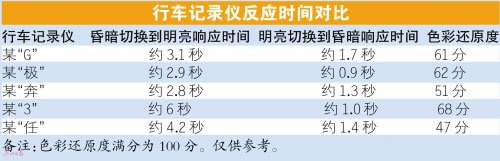 此次測(cè)試,車天下君準(zhǔn)備一個(gè)“黑盒子”,里面放置一個(gè)屏幕常亮的智能手機(jī)。在“黑盒子”外面,放置另外一個(gè)屏幕常亮的智能手機(jī)。切換時(shí)間控制在0.3秒之內(nèi),分為“明到暗”和“暗到明”兩個(gè)環(huán)節(jié),記錄行車記錄儀場(chǎng)景切換時(shí)的響應(yīng)時(shí)間。由測(cè)試結(jié)果一覽表可以看到,參與測(cè)試5個(gè)型號(hào)的行車記錄儀的響應(yīng)時(shí)間都不盡相同:短則1秒,長則6秒。車天下君歸納如下,質(zhì)量合格的行車記錄儀從昏暗切換到明亮環(huán)境的響應(yīng)時(shí)間應(yīng)在3~4秒之間,從明亮切換到昏暗環(huán)境當(dāng)中的響應(yīng)時(shí)間應(yīng)該在1~2秒之內(nèi)。