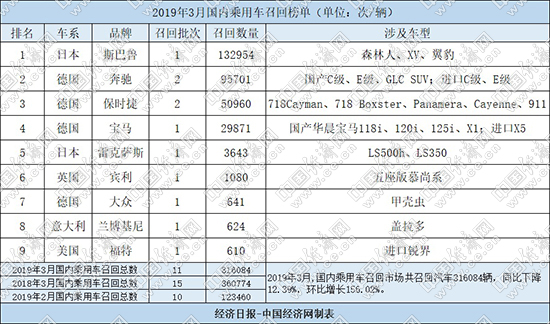 根據(jù)國家市場監(jiān)督管理總局缺陷產(chǎn)品管理中心3月份發(fā)布的召回公告,經(jīng)濟(jì)日報-中國經(jīng)濟(jì)網(wǎng)汽車頻道經(jīng)過匯總、統(tǒng)計,整理出“2019年3月國內(nèi)乘用車召回榜單”。3月,國內(nèi)乘用車市場共有9個品牌累計發(fā)布9起召回公告,共計召回汽車316084輛,同比下降12.39%,環(huán)比增長156.02%。