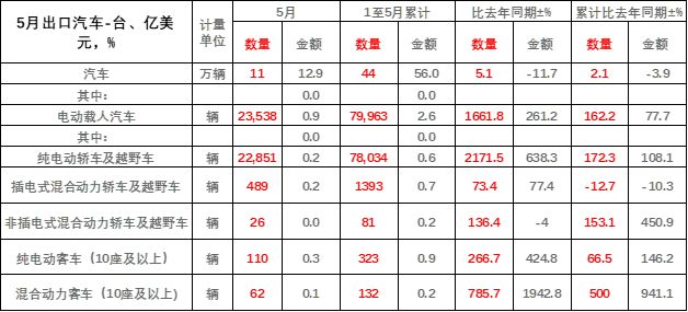 5月,我國(guó)出口汽車10.6萬(wàn)輛,同比增長(zhǎng)5.1%。其中,新能源汽車出口2.35萬(wàn)輛,同比增長(zhǎng)1661.8%。崔東樹(shù)認(rèn)為,新能源汽車對(duì)車市實(shí)現(xiàn)高質(zhì)量增長(zhǎng)具有一定的拉動(dòng)作用,同時(shí)也是國(guó)內(nèi)汽車出口實(shí)現(xiàn)正增長(zhǎng)的強(qiáng)大動(dòng)力。