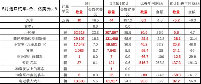 從進(jìn)口額來(lái)看,5月汽車進(jìn)口額為46.5億美元,同比增長(zhǎng)4.6%;1-5月,汽車進(jìn)口額為197.2億美元,同比下降6.3%。