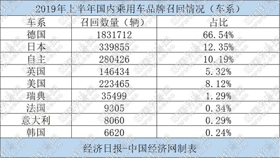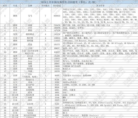 分車系來看,上半年,德系品牌成為召回“主力”,1-6月,德系品牌共召回汽車1831712輛,占召回總量的66.54%,其中寶馬、奔馳分別以830833輛和720479輛的召回數(shù)量,“遙遙領先”其他品牌;而高檔車、超級跑車品牌保時捷更是召回汽車114337輛,數(shù)量甚至遠超其2018年80108輛的銷量總和。