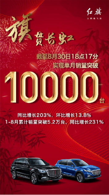 2019年8月30日18點17分,據(jù)紅旗官宣,紅旗品牌單月銷量已突破10000輛,同比增長203%,環(huán)比增長13.8%,至此,1-8月累計實現(xiàn)銷量5.2萬輛,同比增長231%。單月突破10000輛的成績,使紅旗首次躋身月銷萬輛俱樂部,這一極具里程碑意義的銷量數(shù)字,讓紅旗進入了主流豪華品牌陣營,書寫了紅旗誕生61年來新的紀錄,也驗證了紅旗正以氣貫長虹的勇猛之勢,實現(xiàn)著全方位的“跨越”。
