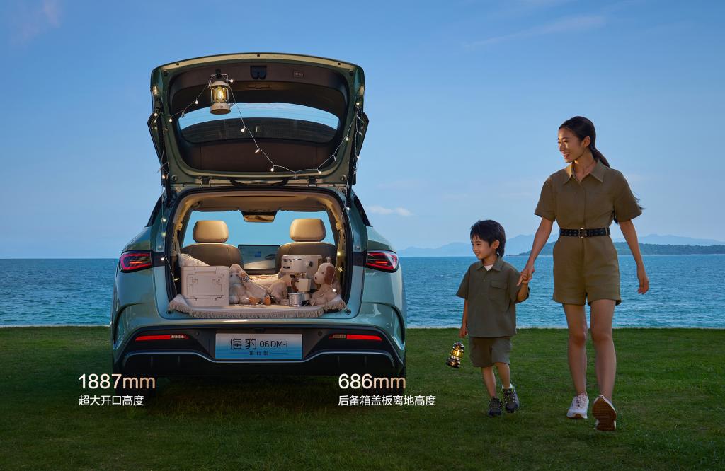 海豹06DM-i旅行版車(chē)身尺寸為4,850mm*1,890mm*1,505mm,軸距為2,790mm,后排座椅放倒后容積達(dá)到1535L,全系標(biāo)配電動(dòng)后尾門(mén),后備箱開(kāi)口高度達(dá)1887mm,后備箱蓋版離地高度僅686mm,可取放大件物品。新車(chē)后備箱還配備同級(jí)最多9個(gè)實(shí)用掛鉤,配合全系標(biāo)配的車(chē)載行李架,空間功能性和拓展性進(jìn)一步提升,實(shí)現(xiàn)場(chǎng)景自由。