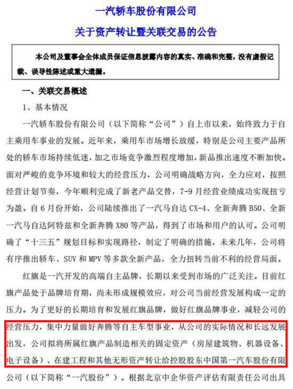根據(jù)此前公告,一汽轎車根據(jù)資產(chǎn)評估的結(jié)果,在和一汽集團協(xié)商一致的前提下,將評估價值為3.7億元的紅旗旗下資產(chǎn),以含增值稅人民幣 4.2億元的交易價格轉(zhuǎn)讓給一汽股份,并且表示, 本次資產(chǎn)轉(zhuǎn)讓的關聯(lián)交易已經(jīng)在第七屆董事會第七次會議中審議通過,在交易合同簽署生效后20天內(nèi)一汽股份需要向一汽轎車支付轉(zhuǎn)讓資產(chǎn)價款。這意味著,紅旗品牌已歸屬于一汽股份所有,從一汽轎車中獨立出來。(圖/文 網(wǎng)通社 陳旭明) (責任編輯:梁艷) |