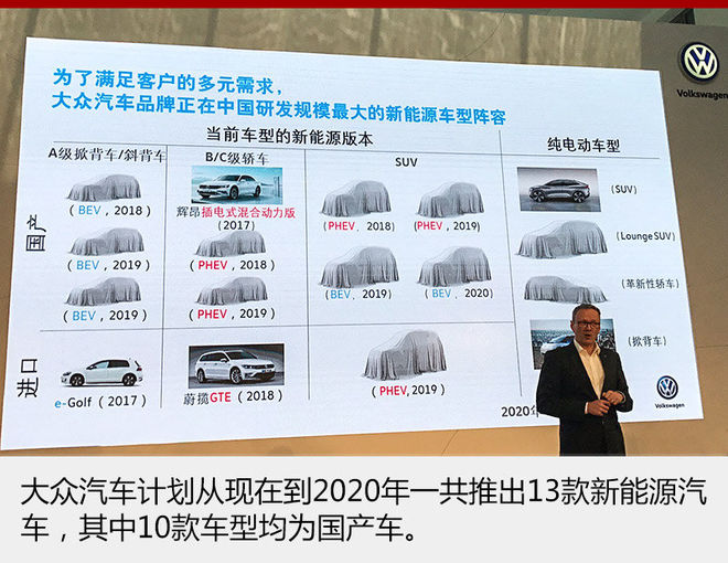 從這張規(guī)劃圖中能夠看到,至2020年大眾汽車在中國新推出13款新能源車,其中有10款車型會(huì)在國內(nèi)進(jìn)行本土化生產(chǎn)。加上已上市的e-UP!和高爾夫GTE,大眾在華新能源車陣容將增至15款。另外,進(jìn)口引入的e-Golf和上汽大眾輝昂插電混動(dòng)版將于年內(nèi)率先投入市場(chǎng)。