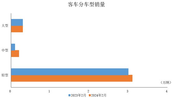2024年2月,客車(chē)產(chǎn)銷(xiāo)分別完成3萬(wàn)輛和3.6萬(wàn)輛,產(chǎn)量環(huán)比下降15.7%,銷(xiāo)量環(huán)比增長(zhǎng)1.6%;產(chǎn)量同比下降13%,銷(xiāo)量同比增長(zhǎng)6.9%。與上月相比,輕型客車(chē)產(chǎn)量呈兩位數(shù)下降、銷(xiāo)量小幅增長(zhǎng),其他兩大類(lèi)客車(chē)品種產(chǎn)銷(xiāo)均呈兩位數(shù)下降;與上年同期相比,大型客車(chē)和中型客車(chē)產(chǎn)銷(xiāo)均呈明顯增長(zhǎng),輕型客車(chē)產(chǎn)量呈兩位數(shù)下降、銷(xiāo)量小幅增長(zhǎng)。