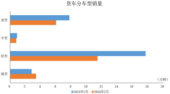 2024年2月,貨車(chē)產(chǎn)銷(xiāo)分別完成20.3萬(wàn)輛和21.5萬(wàn)輛,環(huán)比分別下降30.4%和25.5%;同比分別下降28.2%和25.9%。與上月相比,微型貨車(chē)產(chǎn)量呈兩位數(shù)下降、銷(xiāo)量明顯增長(zhǎng),其他三大類(lèi)貨車(chē)品種產(chǎn)銷(xiāo)均呈兩位數(shù)下降;與上年同期相比,中型貨車(chē)產(chǎn)量呈兩位數(shù)增長(zhǎng)、銷(xiāo)量呈兩位數(shù)下降,微型貨車(chē)產(chǎn)量呈兩位數(shù)下降、銷(xiāo)量呈兩位數(shù)增長(zhǎng),重型貨車(chē)和輕型貨車(chē)產(chǎn)銷(xiāo)均呈明顯下降。
