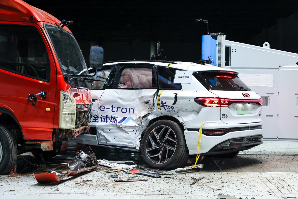 一汽奧迪Q6L e-tron碰撞前處于貨車(chē)與剛性柱體之間