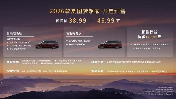 8月29日,第二十八屆成都國(guó)際汽車展覽會(huì)盛大開(kāi)幕。全面煥新升級(jí)的“新時(shí)代旗艦MPV”2026款嵐圖夢(mèng)想家預(yù)售亮相。本次新車共推出智能超混版和智能純電版兩個(gè)動(dòng)力版本,預(yù)售價(jià)為38.99萬(wàn)-45.99萬(wàn),同步推出了價(jià)值超萬(wàn)元的多項(xiàng)重磅權(quán)益,包括2000元抵5000元尾款的膨脹金,終身免費(fèi)三電質(zhì)保、終身免費(fèi)基礎(chǔ)保養(yǎng)和優(yōu)先交付提車。9月1日起,2026款嵐圖夢(mèng)想家展車、試駕車將陸續(xù)到店,消費(fèi)者可以進(jìn)店親自體驗(yàn)新車的獨(dú)特魅力。