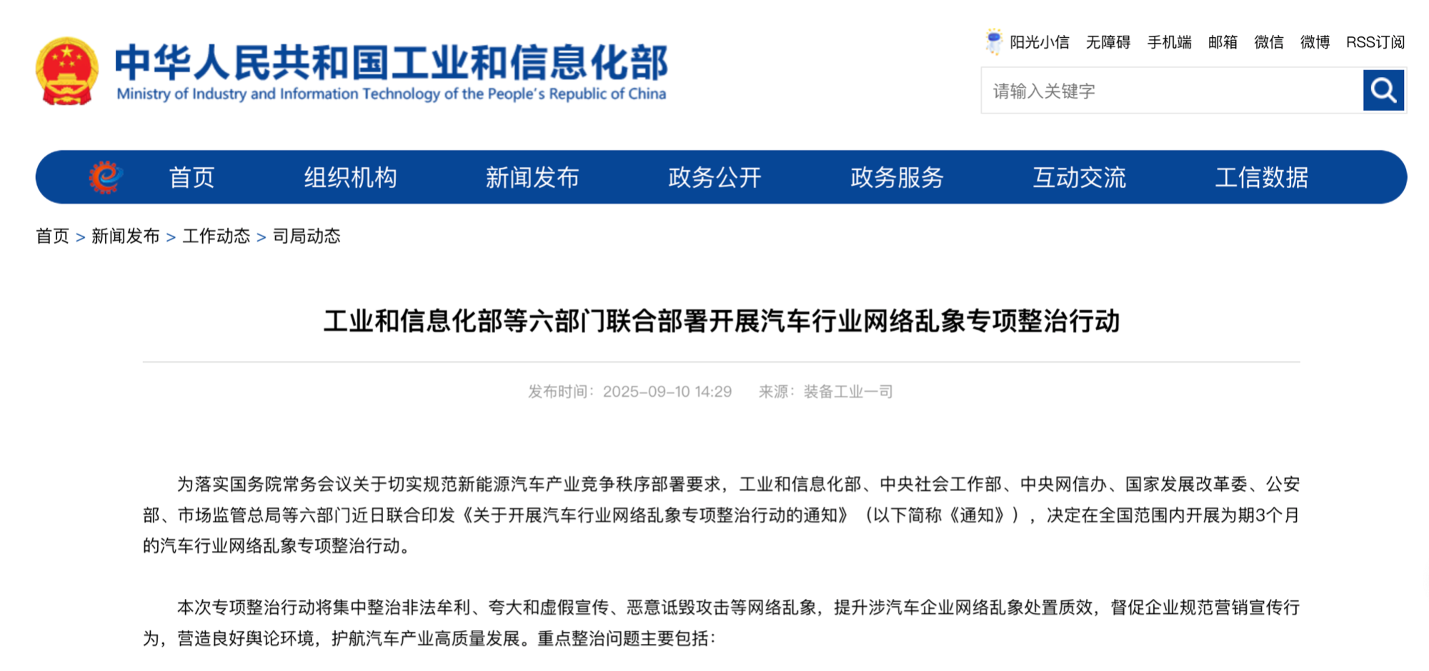 央廣網(wǎng)北京9月10日消息(記者董楠)9月10日,工業(yè)和信息化部(以下簡稱“工信部”)、中央社會工作部、中央網(wǎng)信辦、國家發(fā)展改革委、公安部、市場監(jiān)管總局等六部門聯(lián)合印發(fā)《關(guān)于開展汽車行業(yè)網(wǎng)絡亂象專項整治行動的通知》,決定在全國范圍內(nèi)開展為期3個月的汽車行業(yè)網(wǎng)絡亂象專項整治行動。