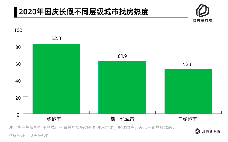 一個城市房產(chǎn)經(jīng)紀(jì)人帶客戶看房量——總帶看量,是衡量樓市熱度重要指標(biāo)。10月1日-7日,一線城市找房熱度高于新一線、二線城市。從城市之間熱度比較看,四個一線城市總帶看熱度指數(shù)為82.3,明顯高于新一線城市的61.9和二線城市52.6。