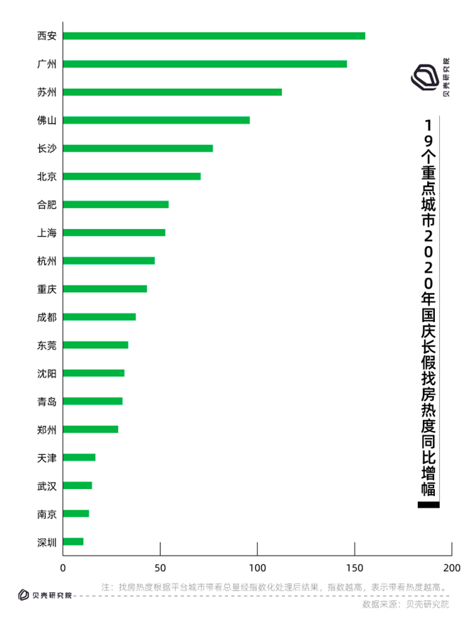 10月9日,貝殼找房發(fā)布了2020年城市“十一”找房熱度(二手房市場),全國多個城市找房活躍度同比去年均不同程度增長,其中西安、廣州、蘇州樓市相對火熱,經(jīng)紀(jì)人總帶看量同比出現(xiàn)了翻倍增長;而深圳、南京樓市趨冷,總帶看量增幅排在19個重點(diǎn)城市最后。