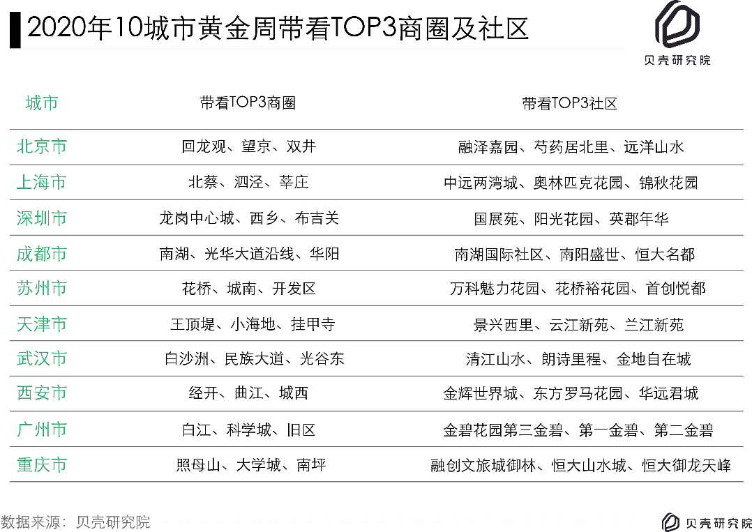 同樣,每個城市都有熱門商圈與人氣社區(qū)。此次,貝殼研究院特別梳理出2020年黃金周期間帶看量最高的十個城市,并找到其熱門商圈和社區(qū)。以城市帶看龍頭北京為例,回龍觀、望京、雙井商圈帶看熱度高,排名城市商圈TOP3;而融澤嘉園、芍藥居北里、遠(yuǎn)洋山水三個社區(qū)帶看熱度在社區(qū)榜中關(guān)注度最高。
