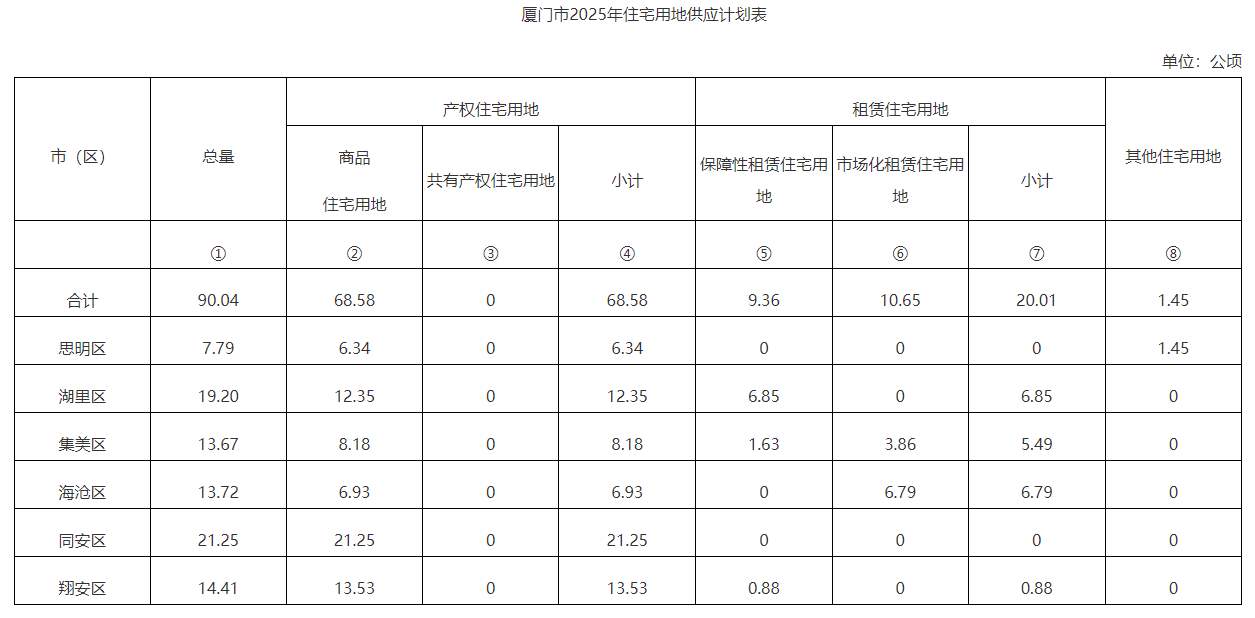 從住宅用地總量和結(jié)構(gòu)來(lái)看,2025年廈門市住宅用地計(jì)劃供應(yīng)90公頃,其中產(chǎn)權(quán)住宅用地69公頃(商品住宅用地69公頃,共有產(chǎn)權(quán)住宅用地0公頃),租賃住宅用地20公頃(保障性租賃住宅用地9公頃,市場(chǎng)化租賃住宅用地11公頃),其他住宅用地(拆遷安置房)1公頃。