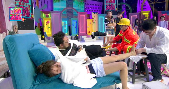 更悲慘的還在后面等著修睿。原地做造型自拍都困難無比,身子完全掌握不到平衡,直接踹翻道具椅,颶風(fēng)碉堡更是變成一座阻擋他前進的大山,一步兩步往前跳,努力自拍擺造型,無奈實在抵擋不住勁風(fēng),直接單膝跪地整個人撲倒。和美女體驗情景自拍,抽到“撲倒與被撲倒”,被搭檔嫌棄還要忍受撓腳心的煎熬,拍出驚悚照被張大大、小甜甜一陣暴風(fēng)吐槽。而喬杉則和一貫的老搭檔小甜甜再度演繹情景,兩人同吃小香腸自拍,一邊喬杉被撓腳心哭笑不得,氣得搶下按摩器直敲“按摩師”。