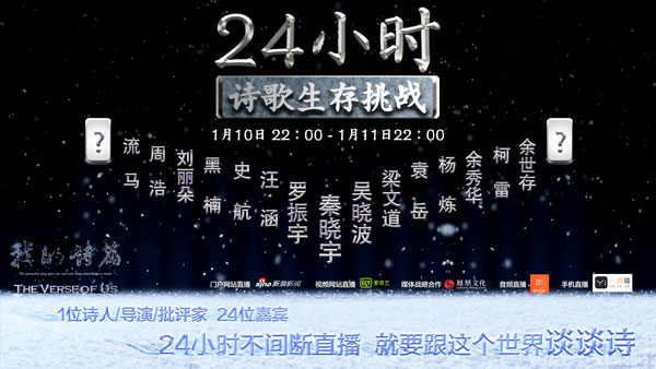據(jù)了解,從1月10日晚22:00開始,秦導(dǎo)邀請了24位各界知名人士,24小時(shí)不間斷直播接力談詩歌。自媒體“羅輯思維”創(chuàng)始人羅振宇,著名財(cái)經(jīng)作家、財(cái)經(jīng)自媒體“吳曉波頻道”創(chuàng)始人吳曉波,國際著名詩人楊煉,香港著名文化人梁文道,湖南衛(wèi)視著名主持人汪涵,自媒體人袁岳,著名知識分子余世存,詩人余秀華,詩人、詩歌自媒體“讀首詩再睡覺”公號主編流馬,編劇史航,金馬獎最佳紀(jì)錄片導(dǎo)演周浩,歐洲著名漢學(xué)家柯雷,著名音樂人黑楠等人,將通過現(xiàn)場、電話連線、視頻等多種方式參與本次在線直播活動,而鳳凰衛(wèi)視著名主持人曹景行、著名主持人崔永元以及詩歌評論家唐曉渡也有望一起參與。