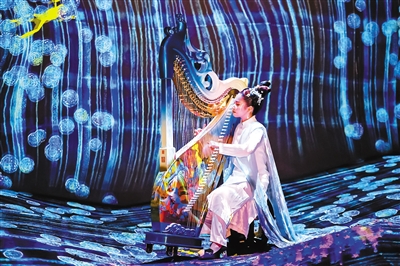 以往的音樂會中,觀眾是在固定位置坐著聽,而在沉浸音樂會《只此一夢》上,現(xiàn)場的觀眾跟隨著指引不斷行進,從而開啟了一種新的聽音樂和逛展覽的模式。例如,《無窮無盡的水晶宇宙》本來就是北京teamLab無相藝術空間的網(wǎng)紅打卡點,如水晶雨滴一般的視覺呈現(xiàn),配合琵琶叮咚如玉珠散落水晶盤中,竹笛聲悠揚似鷓鴣穿飛瓊林苑里,正是玉樹瓊枝點點鳥,珠花盛開鷓鴣飛!《只此一夢》沉浸音樂會是可以聽的畫面,是可以看的音符,觀眾與樂手可謂“零距離”。