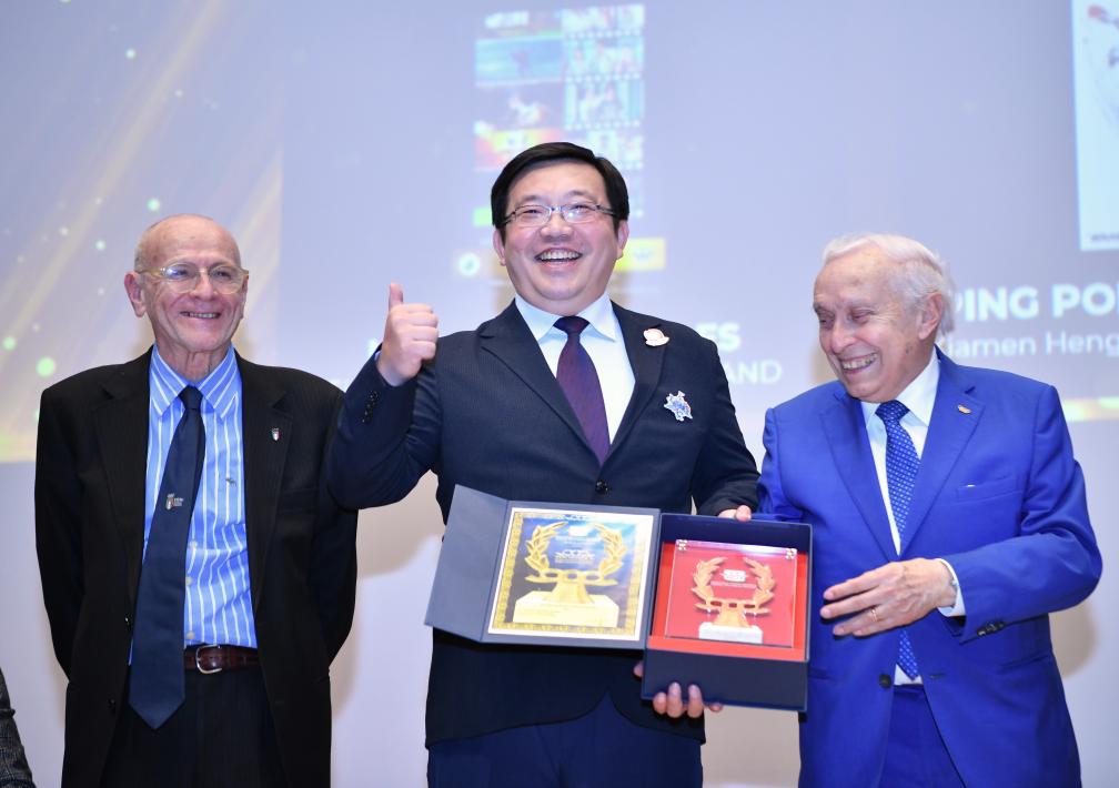 11月11日,影片《我們的冬奧》監(jiān)制、導演王諍(中)在頒獎典禮上領取金花環(huán)獎。新華社記者 任鵬飛 攝
