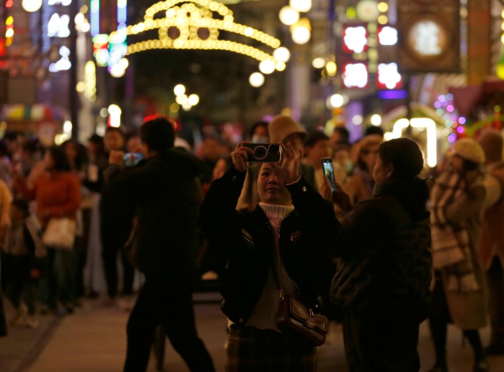 11月16日晚,游人在建業(yè)電影小鎮(zhèn)內(nèi)游覽拍照。新華社記者 戴翹楚 攝