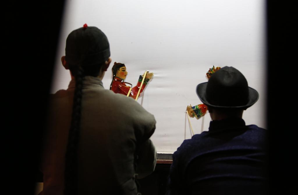 11月16日晚,工作人員在建業(yè)電影小鎮(zhèn)內(nèi)為游人表演皮影戲。新華社記者 戴翹楚 攝