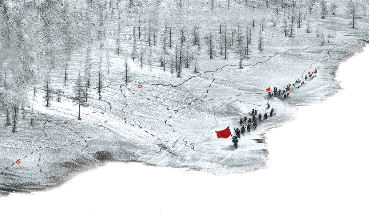 每年很長時間,這里的氣候不適合室外生存,冬季氣溫更低至零下三四十度,有人的耳朵、手指、腳趾甚至?xí)粌龅?。日軍將?dāng)?shù)卮迕駨?qiáng)制集中居住,抗聯(lián)得不到食物、衣服等。正如《歸隊》中所呈現(xiàn)出來的那樣:戰(zhàn)士們輕易不能生火取暖,深可沒腰的積雪限制了我方移動,行蹤又很容易被發(fā)現(xiàn)——敵人會沿著雪地上的腳印,進(jìn)行追擊。