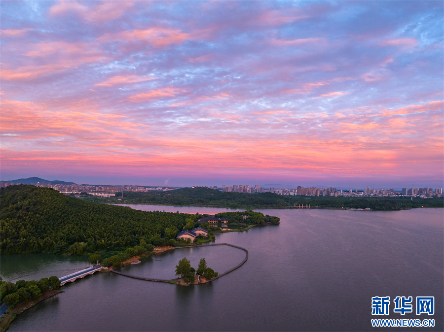 近日,安徽省池州市平天湖上空出現(xiàn)絕美朝霞景觀。新華網(wǎng)發(fā)(程爽 攝)