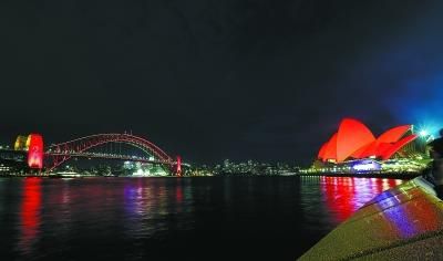 ▲2月4日,悉尼歌劇院和海港大橋同時點亮象征吉祥的紅色照明,悉尼環(huán)形碼頭也點亮了代表十二生肖的花燈。 新華社記者