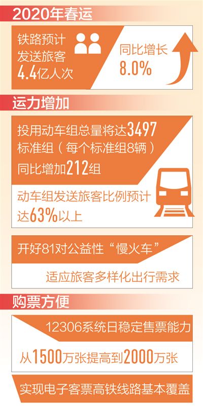 國(guó)鐵集團(tuán)相關(guān)負(fù)責(zé)人介紹,2020年鐵路春運(yùn)自1月10日開始,2月18日結(jié)束,共40天,節(jié)前15天,節(jié)后25天。鐵路部門安排節(jié)前每日開行旅客列車5275對(duì),運(yùn)輸能力達(dá)到1010萬(wàn)人;節(jié)后每日開行旅客列車5410對(duì),運(yùn)輸能力達(dá)到1043萬(wàn)人。