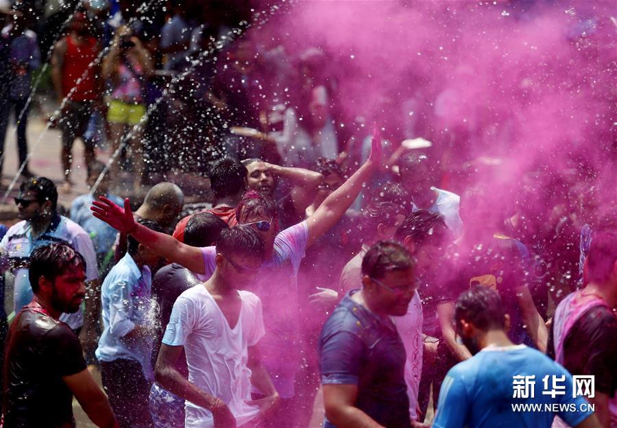 胡里節(jié)也叫“灑紅節(jié)”,人們?cè)谧约耗樕虾蜕砩贤可项伭希€向別人拋撒五顏六色的顏料和粉末,迎接春天的到來(lái)。新華社發(fā)(吳昂 攝)