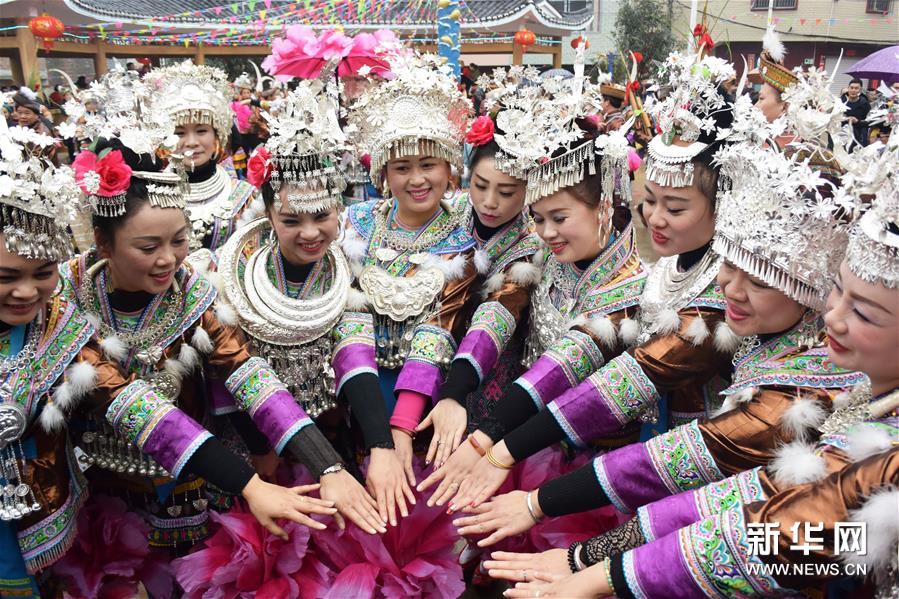2月7日,廣西融水苗族自治縣安太鄉(xiāng)苗族群眾開展傳統(tǒng)的“打同年”民俗活動。當?shù)財?shù)百名苗族同胞與游客們歡聚一堂,一起開展對歌、蘆笙踩堂、文藝晚會等活動,歡慶新春佳節(jié)。 “打同年”是融水苗族村寨的一種民俗,即友好村寨之間的拜年聯(lián)歡活動。新華社記者 李斌 攝
