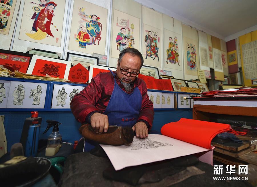 春節(jié)期間,山西省新絳縣的絳州木版年畫傳承人吳百鎖忙得不可開交,來購(gòu)買“吉祥如意”“雄雞一唱天下白”等主題年畫的顧客絡(luò)繹不絕。山西省非物質(zhì)文化遺產(chǎn)絳州木版年畫發(fā)端于宋金,興盛于明清,從選料到雕刻再到上色都非常講究,一幅年畫的制作需要七八道精細(xì)工序。隨著時(shí)代的變遷,目前已鮮有專職雕刻、印制年畫的匠人。擁有嫻熟雕刻技藝的吳百鎖在傳承傳統(tǒng)工藝的基礎(chǔ)上,積極創(chuàng)作現(xiàn)代題材的作品,希望通過自己的創(chuàng)新讓更多少年兒童了解并愛上木版年畫,讓這門幾乎失傳的技藝綻放新的光彩。新華社記者 曹陽 攝