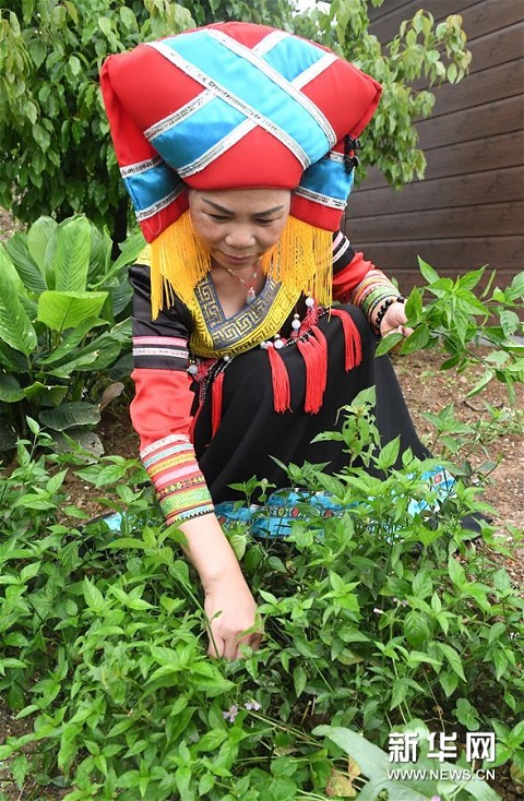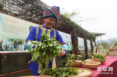 3月25日,在廣西上林縣巷賢鎮(zhèn),一名壯族女子在采摘給糯米染色所需要的植物。新華社記者 陸波岸 攝