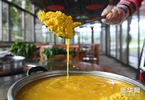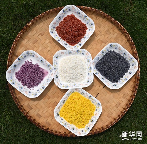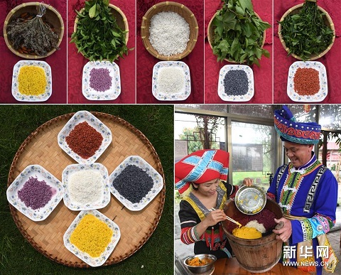 上五圖:4種不同植物及其色素染成的糯米和原色糯米;下左圖:4種不同植物色素染成的糯米和原色糯米;下右圖:在廣西上林縣巷賢鎮(zhèn),兩名壯族村民在查看一桶剛剛蒸熟的五色糯米飯(拼版圖片,3月25日攝)。 每年“壯族三月三”到來之際,廣西的壯族同胞都有蒸制五色糯米飯迎接節(jié)日的習(xí)俗,以祈禱五谷豐登,五福臨門。這些五色糯米飯,主要采用天然植物萃取色素,將糯米分別浸泡到紫、黃、紅、黑4種不同植物色素的水里,充分染色后,與原色糯米一起蒸熟而成。色澤鮮艷、清香誘人的五色糯米飯,是“壯族三月三”接待來客時(shí)必不可少的傳統(tǒng)美食。新華社記者 陸波岸 攝