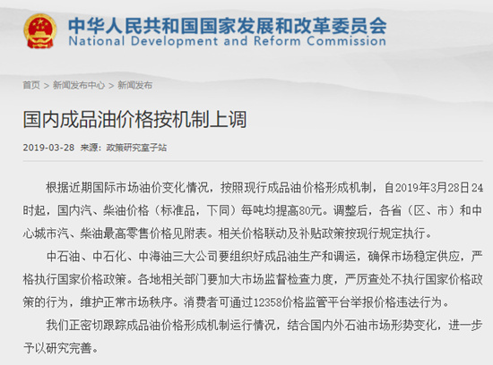 人民網(wǎng)北京3月28日電 (王紹紹) 國家發(fā)改委剛剛發(fā)布通知, 根據(jù)近期國際市場油價(jià)變化情況,按照現(xiàn)行成品油價(jià)格形成機(jī)制,自2019年3月28日24時(shí)起,國內(nèi)汽、柴油價(jià)格(標(biāo)準(zhǔn)品,下同)每噸均提高80元。調(diào)整后,各省(區(qū)、市)和中心城市汽、柴油最高零售價(jià)格見附表。相關(guān)價(jià)格聯(lián)動(dòng)及補(bǔ)貼政策按現(xiàn)行規(guī)定執(zhí)行。