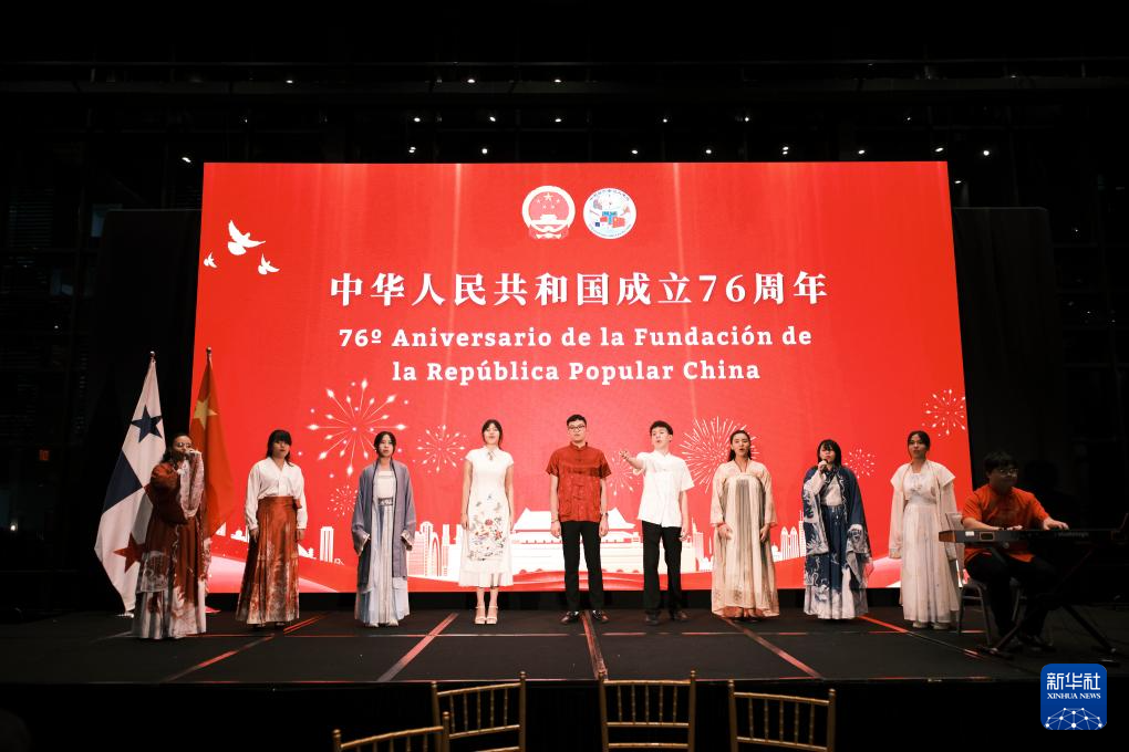 9月22日,在巴拿馬首都巴拿馬城,當(dāng)?shù)厍嗄暝趹c祝中華人民共和國(guó)成立76周年招待會(huì)上合唱中文歌曲。新華社記者 許詠政 攝