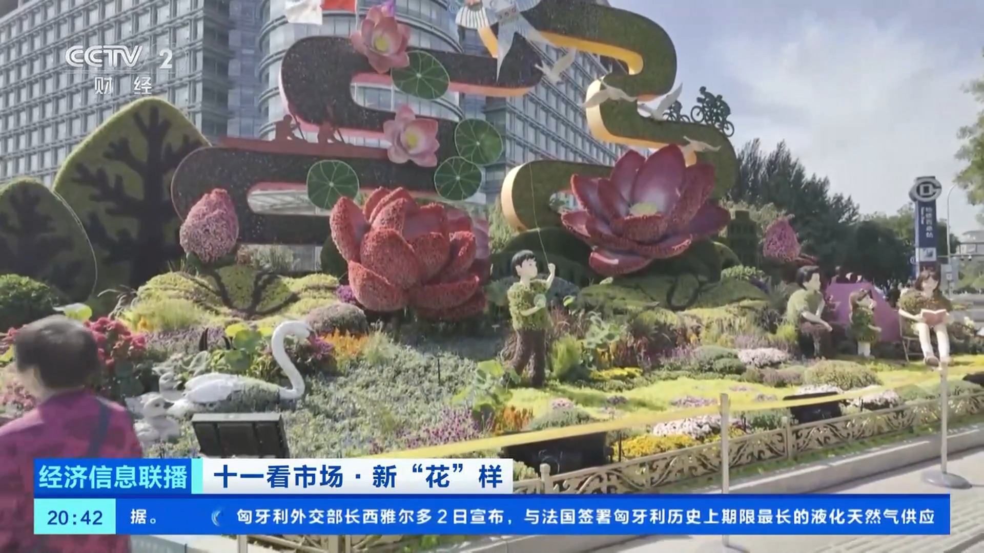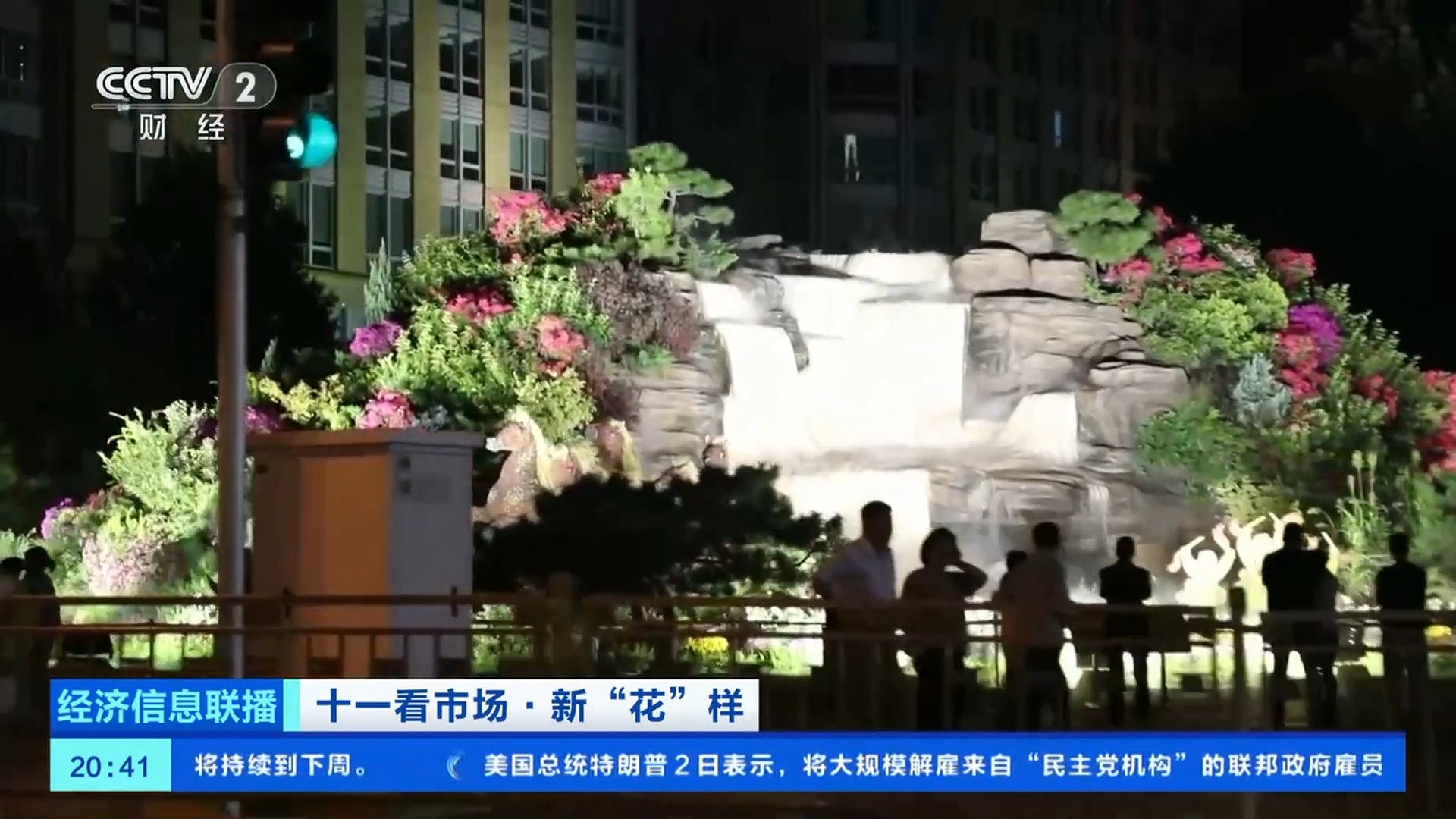 總臺央視記者 王聞聰:今年北京天安門廣場中心花壇的大花籃和長安街沿線的10組立體花壇,都在國慶中秋假期增添了夜間照明設施,讓夜晚的花壇更加引人注目。北京東單東南角的“黃河贊歌”立體花壇,也被稱為是“會唱歌的花壇”。在花壇上不僅能看到微觀的壺口瀑布、奔騰的駿馬、載歌載舞的人群,還有水霧、音樂等聲光電技術(shù),更加逼真地還原了黃河之水天上來的氣勢。晚上八點,這里仍有大量游客前來拍照打卡。