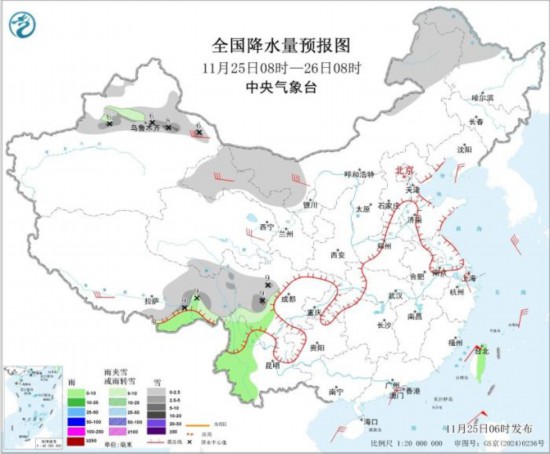 全國降水量預(yù)報(bào)圖(11月25日08時(shí)-26日08時(shí))