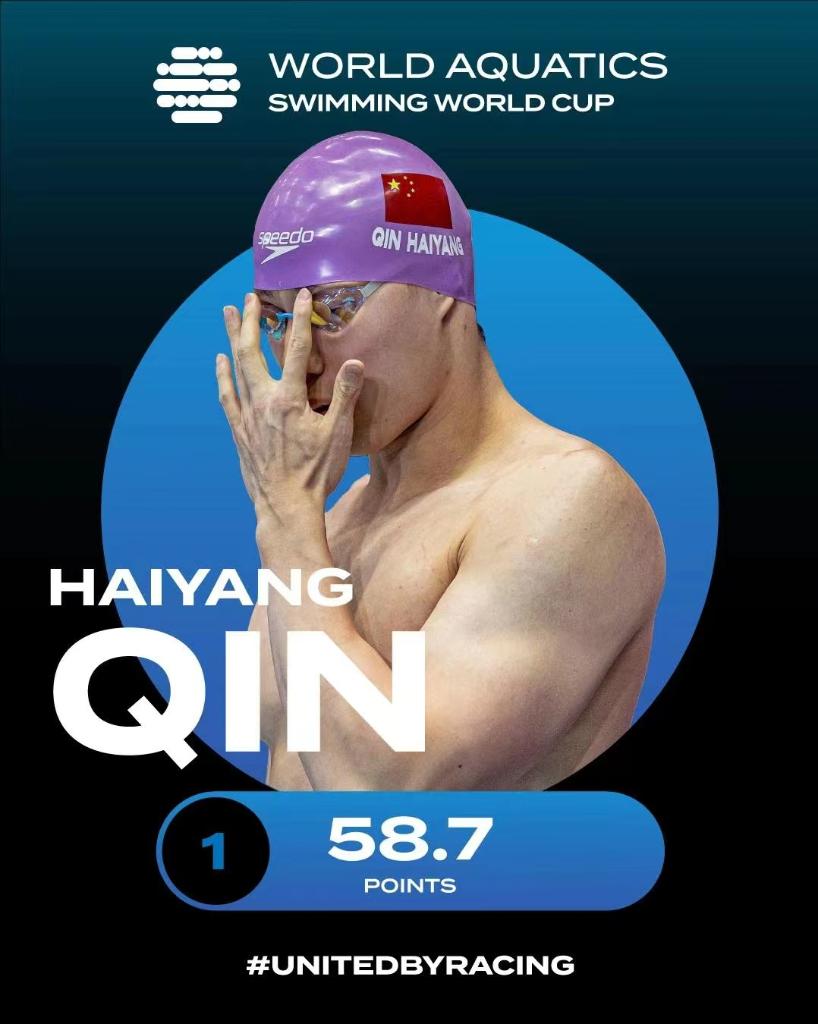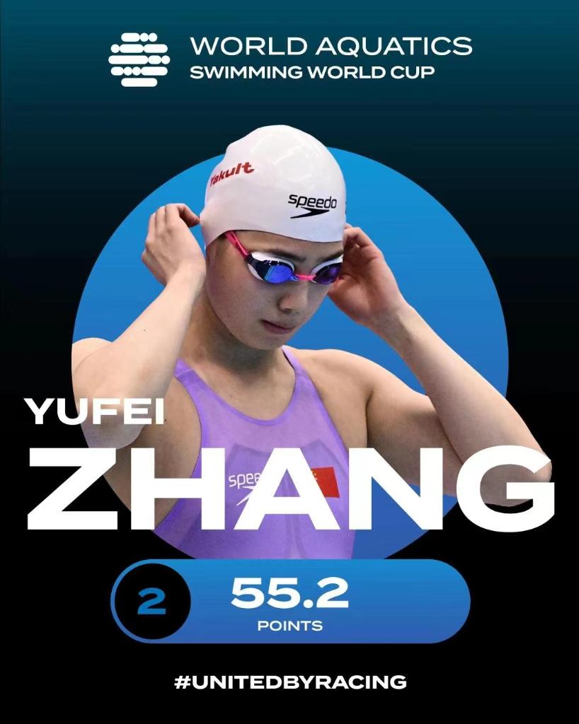 何詩(shī)蓓則以52秒02的成績(jī)改寫她9月底在杭州亞運(yùn)會(huì)創(chuàng)造的女子100米自由泳亞洲紀(jì)錄52秒17,成為該項(xiàng)目歷史上第三快的選手,她還收獲了200米自由泳金牌和400米自由泳銅牌,在積分榜列第三名。