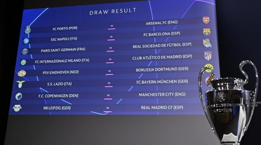 具體對陣如下:波爾圖(葡超)對陣阿森納(英超)、那不勒斯(意甲)對陣巴塞羅那(西甲)、巴黎圣日耳曼(法甲)對陣皇家社會(西甲)、國際米蘭(意甲)對陣馬德里競技(西甲)、埃因霍溫(荷甲)對陣多特蒙德(德甲)、拉齊奧(意甲)對陣拜仁慕尼黑(德甲)、哥本哈根(丹超)對陣曼城(英超)、萊比錫(德甲)對陣皇家馬德里(西甲)。 此外,本賽季歐羅巴聯(lián)賽淘汰賽附加賽對陣也于當(dāng)天出爐。費耶諾德(荷甲)對陣羅馬(意甲)、AC米蘭(意甲)對陣?yán)锥鳎ǚ祝⒗仕梗ǚ祝﹃嚫ベ嚤ぃǖ录祝?、伯爾尼年輕人(瑞士超)對陣葡萄牙體育(葡超)、本菲卡(葡超)對陣圖盧茲(法甲)、布拉加(葡超)對陣卡拉巴赫(阿塞拜疆超級聯(lián)賽)、加拉塔薩雷(土超)對陣布拉格斯巴達(dá)(捷甲)、頓涅茨克礦工(烏超)對陣馬賽(法甲)。