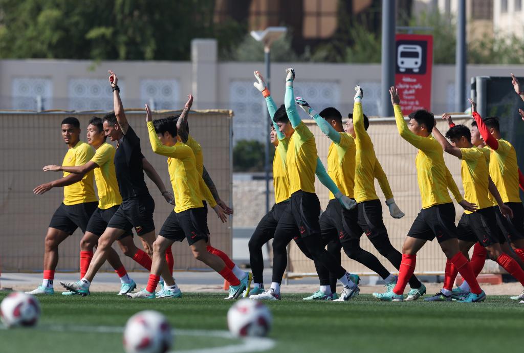 1月11日,中國(guó)男足隊(duì)員在卡塔爾多哈進(jìn)行訓(xùn)練,備戰(zhàn)將于1月12日開(kāi)賽的卡塔爾男足亞洲杯。新華社記者丁汀攝