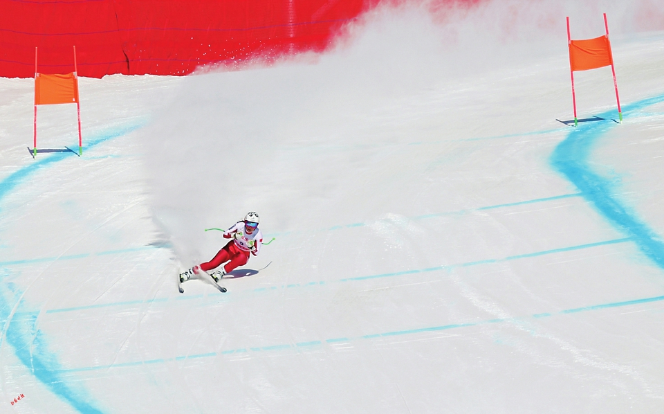 高山之巔,白雪之上,滑雪運(yùn)動(dòng)員在落差高達(dá)547米的雪道上滑降,他們穿行、回轉(zhuǎn),快似閃電,如雪上飛燕。