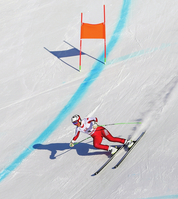 在高山滑雪女子滑降比賽收獲銀牌的倪悅名在比賽中。