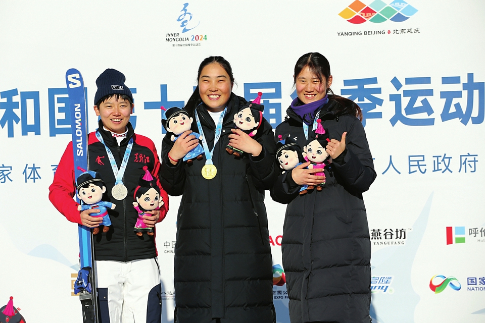 公開(kāi)組女子滑降比賽頒獎(jiǎng)現(xiàn)場(chǎng),冠亞季軍合影。