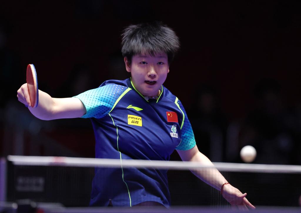 2月19日,中國(guó)隊(duì)孫穎莎在第二盤(pán)比賽中回球。新華社記者 楊世堯 攝