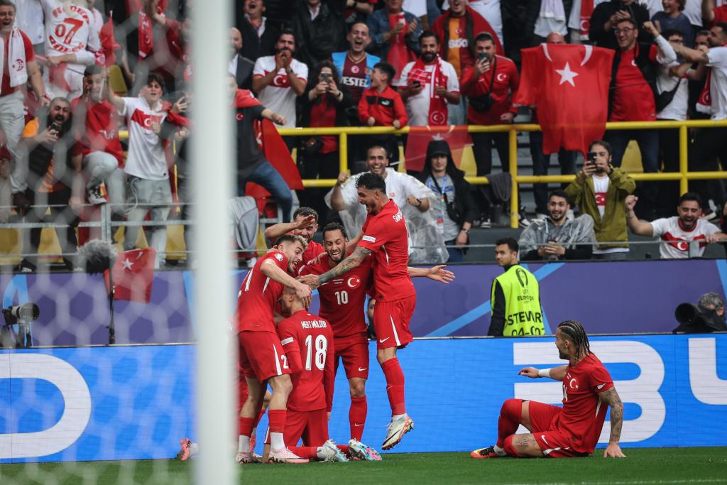 6月18日,土耳其隊(duì)球員梅爾特·穆爾杜爾(18號)進(jìn)球后與隊(duì)友慶祝。新華社記者 潘昱龍 攝