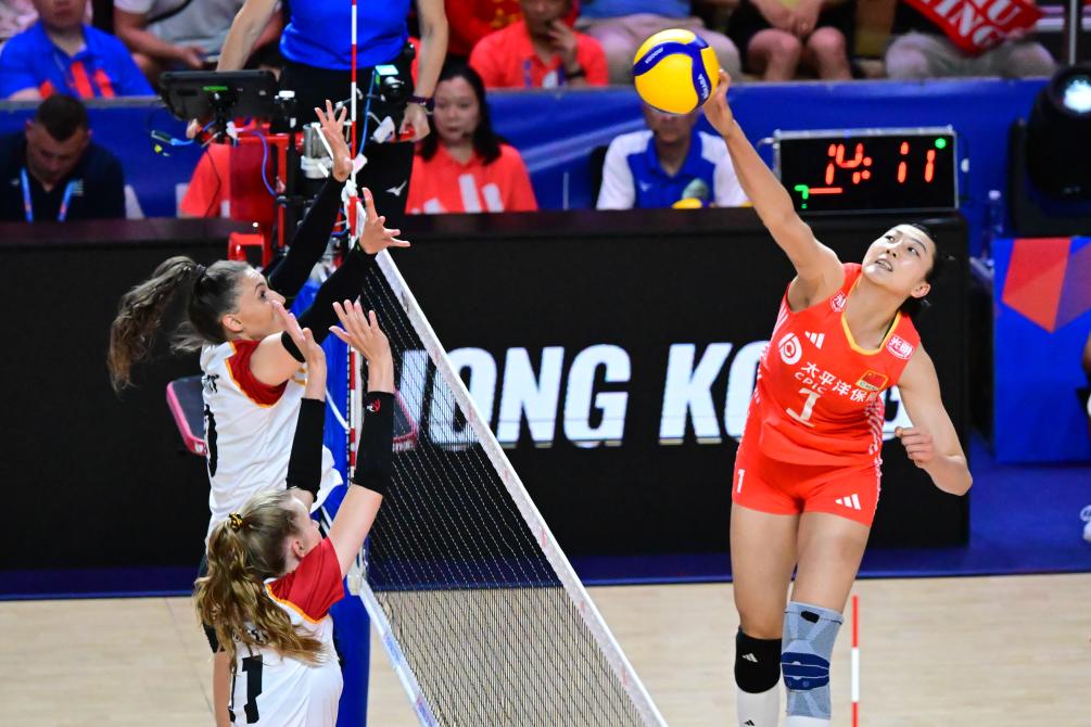 6月14日,中國隊球員袁心玥(右)在比賽中扣球。當日,在世界女排聯賽中國香港站比賽中,中國隊3比0戰(zhàn)勝德國隊。新華社記者 朱煒 攝