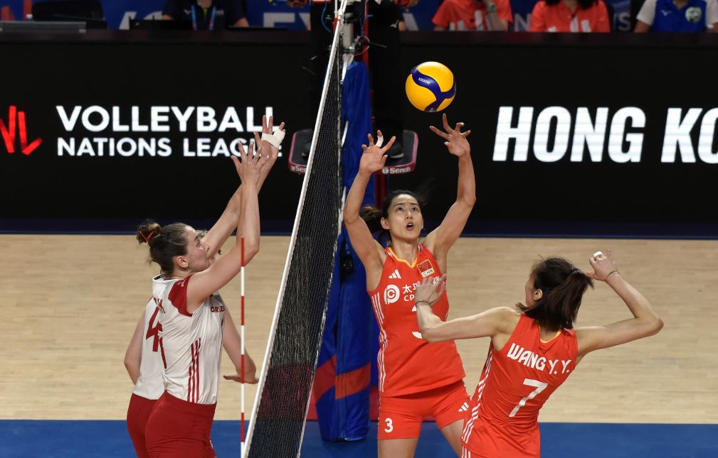 6月16日,中國隊球員刁琳宇(右二)在比賽中傳球。當日,在世界女排聯賽中國香港站比賽中,中國隊3比0戰(zhàn)勝波蘭隊。新華社記者 盧炳輝 攝