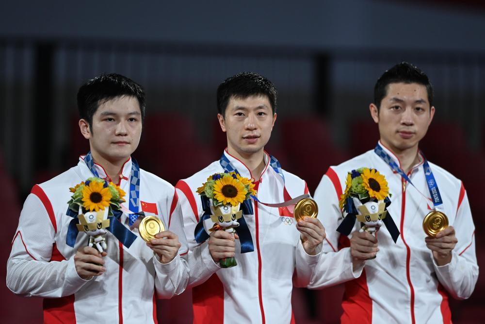 2021年8月6日,中國隊選手馬龍(中)、許昕(右)、樊振東在頒獎儀式上。當(dāng)日,在東京奧運會乒乓球男子團(tuán)體決賽中,中國隊以3:0的總比分戰(zhàn)勝德國隊,奪得冠軍。新華社記者 黃宗治 攝