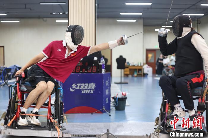即將出征巴黎殘奧會的擊劍運動員仲賽春(左)與隊友胡道亮練習擊劍動作。中新網記者泱波 攝